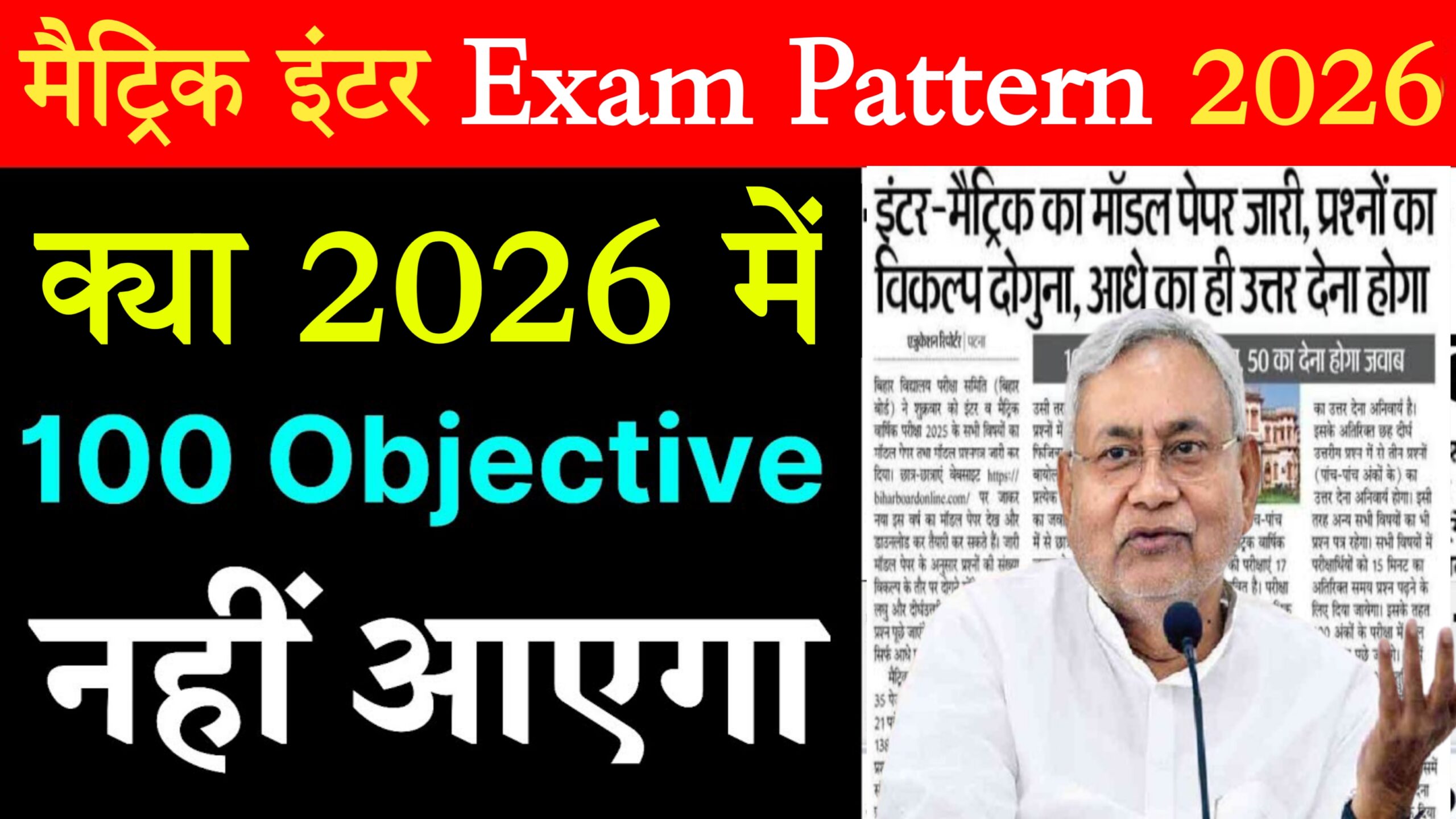 नमस्कार दोस्तों! अगर आप बिहार स्कूल एग्जामिनेशन बोर्ड (BSEB) के मैट्रिक (10वीं) या इंटरमीडिएट (12वीं) 2026 की परीक्षा की तैयारी कर रहे हैं, तो सबसे बड़ा सवाल यही है कि नया सिलेबस और एग्जाम पैटर्न क्या है, और ऑब्जेक्टिव (MCQ) प्रश्नों की संख्या 100 होगी या 60। आज की तारीख (26 नवंबर 2025) के अनुसार, BSEB ने 2025-26 सेशन के लिए नया सिलेबस और एग्जाम पैटर्न जारी कर दिया है, जो NEP 2020 पर आधारित है। मैट्रिक में ऑब्जेक्टिव प्रश्नों की संख्या 100 है (जिनमें से 50 हल करने हैं, कुल 50 अंक), जबकि इंटरमीडिएट में 50% ऑब्जेक्टिव (लगभग 50-70 प्रश्न, 35-50 अंक) है। यह पैटर्न पिछले वर्षों जैसा ही है, लेकिन MCQ का वेटेज 50% रखा गया है। सिलेबस NCERT बेस्ड है, और कोई बड़ा बदलाव नहीं। इस आर्टिकल में हम आपको मैट्रिक और इंटर 2026 का नया सिलेबस, एग्जाम पैटर्न, ऑब्जेक्टिव प्रश्नों की संख्या, मार्किंग स्कीम, और तैयारी टिप्स बताएंगे। जानकारी ऑफिशियल BSEB साइट और लेटेस्ट अपडेट्स से ली गई है। चलिए, शुरू करते हैं!
