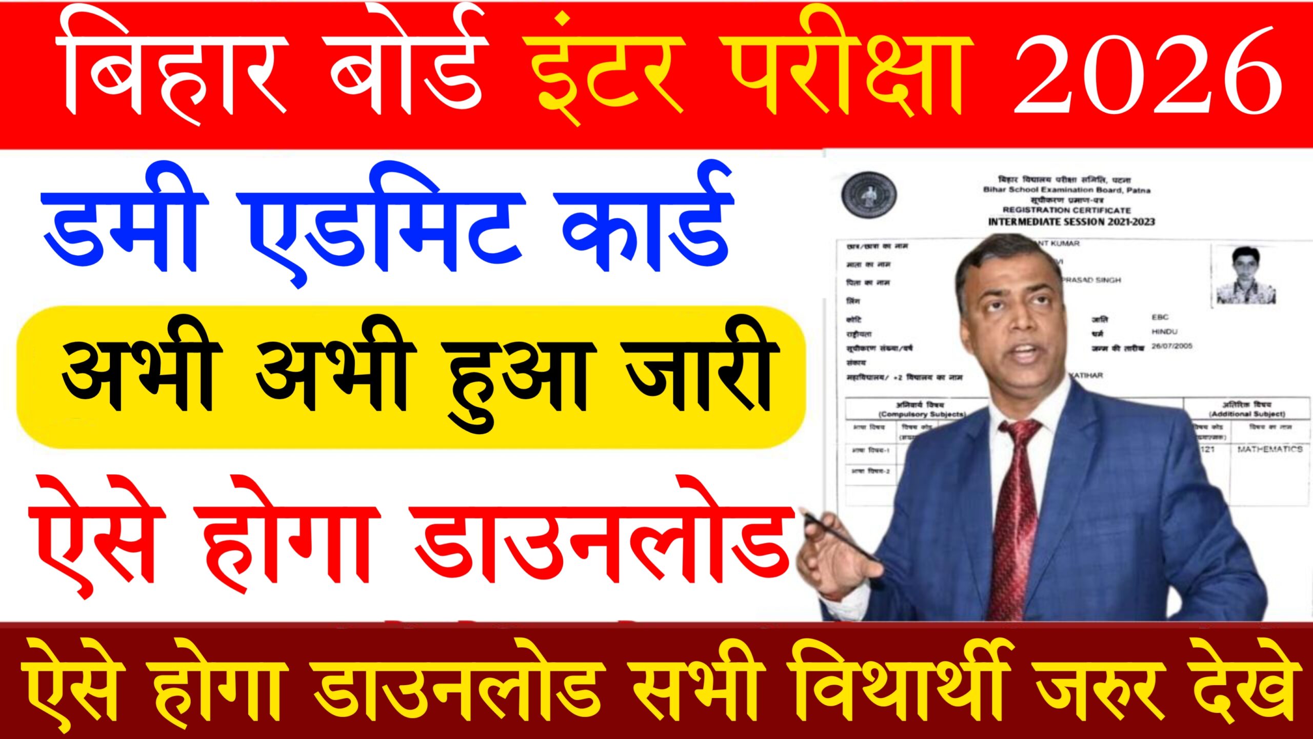 नमस्कार दोस्तों! अगर आप बिहार बोर्ड 12वीं (इंटरमीडिएट) 2026 की परीक्षा की तैयारी कर रहे हैं, तो यह खबर आपके लिए बेहद महत्वपूर्ण है। बिहार स्कूल एग्जामिनेशन बोर्ड (BSEB) ने कक्षा 12वीं वार्षिक परीक्षा 2026 के लिए डमी एडमिट कार्ड (Dummy Admit Card) जारी कर दिया है। यह कार्ड वास्तव में डमी रजिस्ट्रेशन कार्ड के रूप में जाना जाता है, जो छात्रों को अपनी पर्सनल और एकेडमिक डिटेल्स चेक करने का मौका देता है। अगर नाम, जन्म तिथि, फोटो या अन्य जानकारी में कोई गलती है, तो सुधार का समय है – वरना फाइनल एडमिट कार्ड में बदलाव मुश्किल हो जाएगा। इस आर्टिकल में हम आपको BSEB 12th Dummy Admit Card 2026 की पूरी डिटेल बताएंगे – डाउनलोड लिंक, जारी होने की तारीख, करेक्शन डेट, सुधार प्रक्रिया, महत्वपूर्ण डेट्स, और कॉमन मिस्टेक्स से बचने के टिप्स। यह जानकारी सरल हिंदी में विस्तार से दी गई है, जो ऑफिशियल सोर्स से ली गई है। चलिए, शुरू करते हैं!