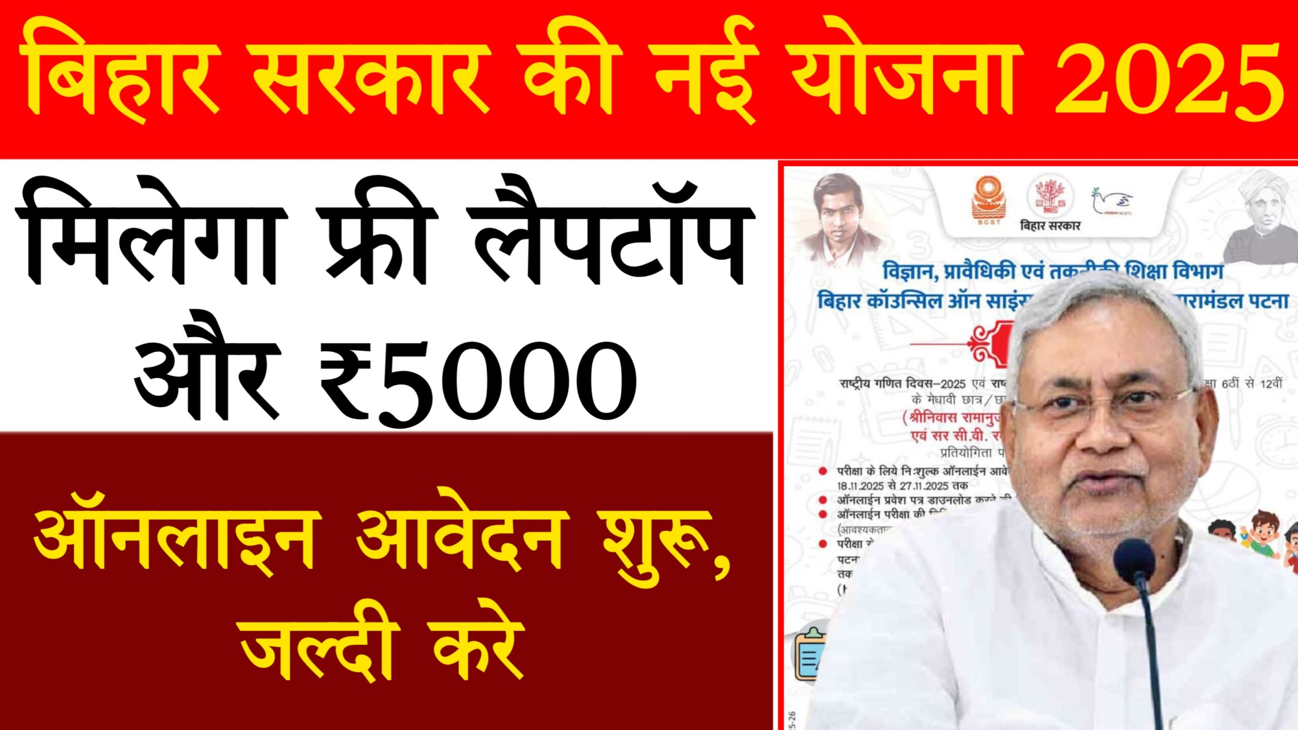 नमस्कार दोस्तों! बिहार सरकार ने छात्रों को प्रोत्साहित करने के लिए एक नई योजना लॉन्च की है – Bihar Talent Search Test 2025 (BTST 2025)। यह योजना कक्षा 6वीं से 12वीं तक के मेधावी छात्रों के लिए है, जिसमें परीक्षा में सफल होने वाले छात्रों को फ्री लैपटॉप और ₹5000 की सहायता राशि मिलेगी। यह टेस्ट गणित और विज्ञान पर आधारित है, और इसका उद्देश्य छात्रों में इन विषयों के प्रति रुचि बढ़ाना है। आवेदन प्रक्रिया ऑनलाइन शुरू हो चुकी है, और लास्ट डेट 31 दिसंबर 2025 है – जल्दी अप्लाई करें! यह योजना बिहार स्कूल एग्जामिनेशन बोर्ड (BSEB) और बिहार मैथेमेटिकल सोसाइटी (BMS) के सहयोग से चलाई जा रही है। इस आर्टिकल में हम आपको BTST 2025 की पूरी डिटेल बताएंगे – एलिजिबिलिटी, अप्लाई कैसे करें, परीक्षा पैटर्न, पुरस्कार, और टिप्स। यह जानकारी सरल हिंदी में विस्तार से दी गई है, जो ऑफिशियल सोर्स से ली गई है। चलिए, शुरू करते हैं!